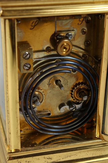 A FRENCH BRASS CARRIAGE CLOCK with eight day movement, striking on a gong, with cream enamel dial on a matted silvered ground, repeat button.