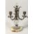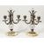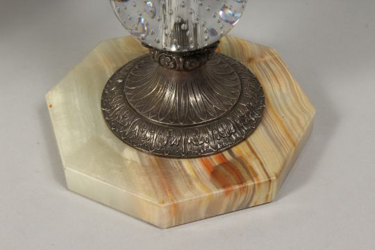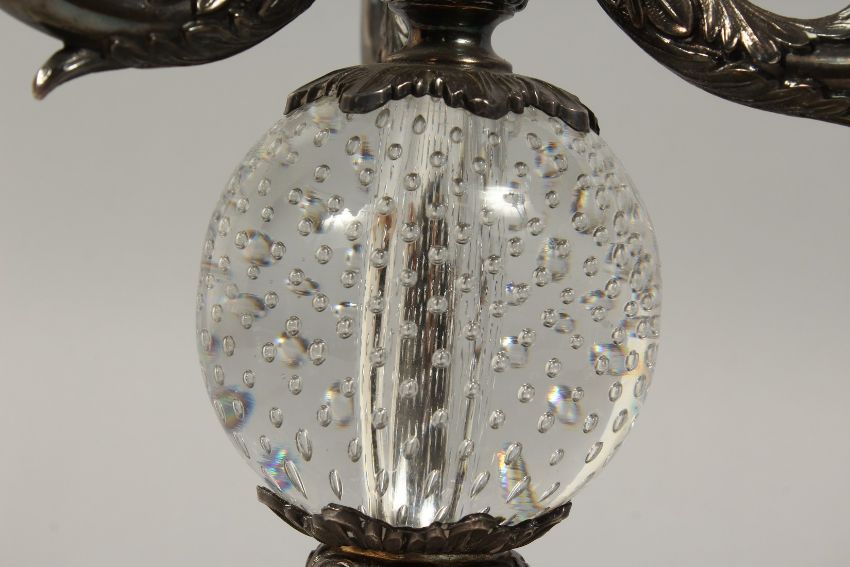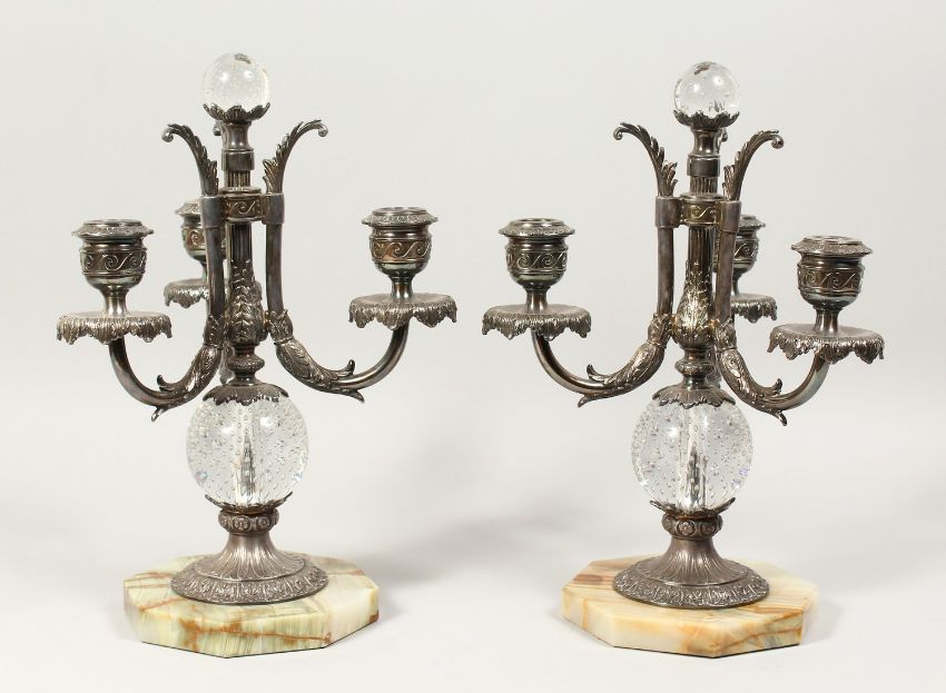 A GOOD PAIR OF SILVER PLATED, GLASS AND ALABASTER CANDELABRA, with three scrolling branches, glass sphere finials and body on an hexagonal alabaster base.