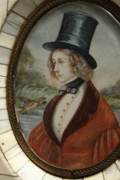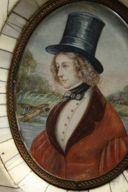 A GOOD PORTRAIT MINIATURE, half length of a young lady wearing a top hat, a duck flying from a lake.
