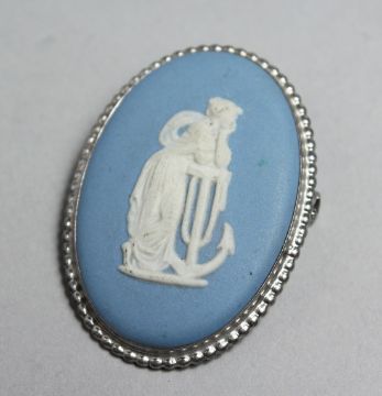 A SILVER MOUNTED WEDGWOOD JASPERWARE BROOCH, 1.75ins high.