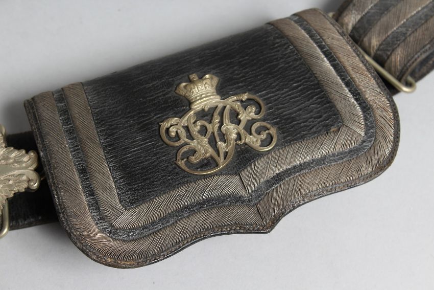 A VICTORIAN MEDICAL OFFICER'S LEATHER AND SILVER EMBOSSED POUCH AND STRAP.