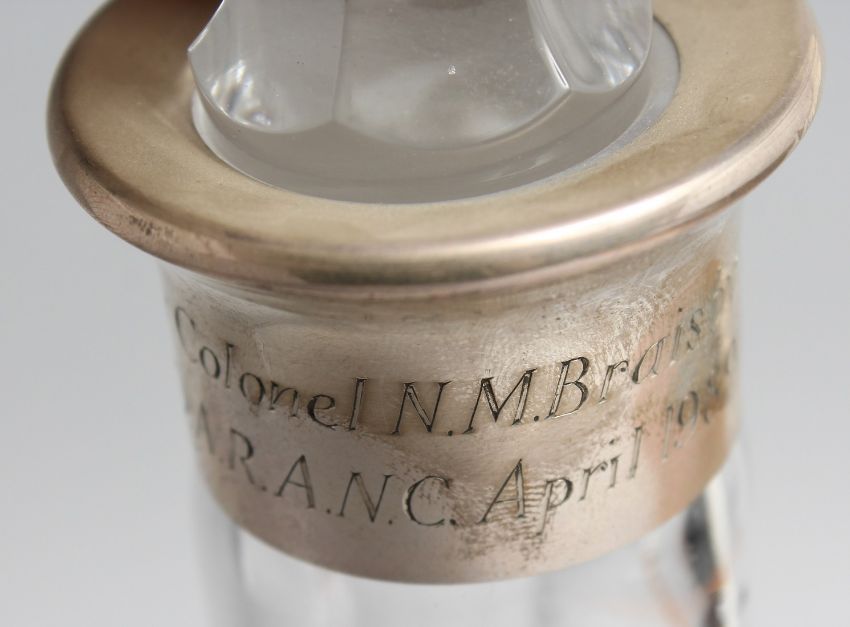 A CRYSTAL GLASS DECANTER AND STOPPER with silver band, engraved: Presented by Colonel N M Braisby MBE. RPC. Q.A.R.A.N.C. April 1989
