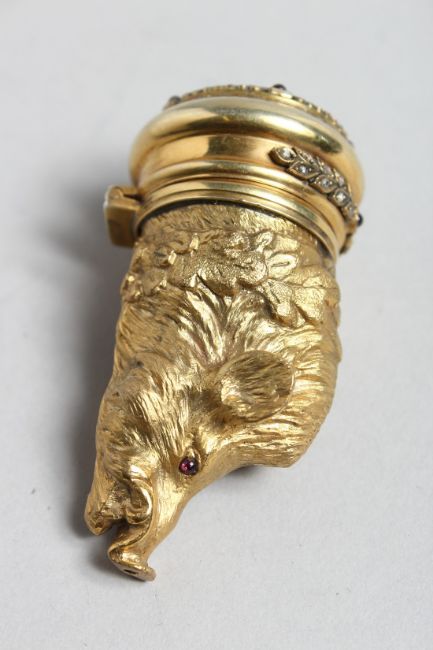 A VERY GOOD RUSSIAN SILVER GILT BOARS HEAD SNUFF BOX, with inset enamel decoration and precious stones, 2.75ins long.