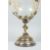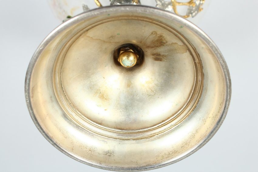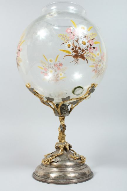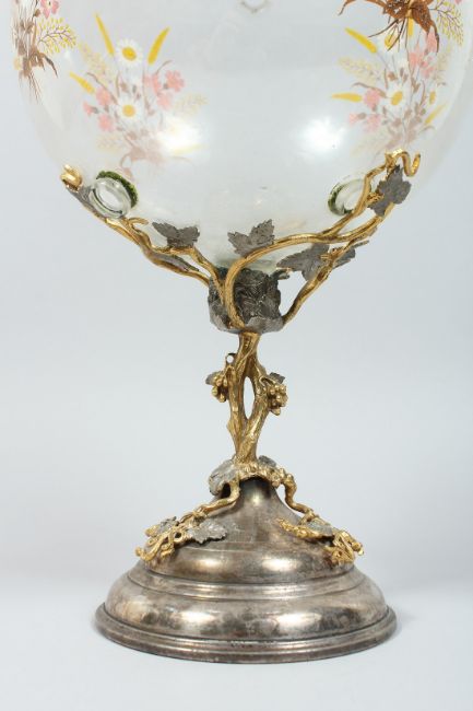 AN UNUSUAL SILVER PLATED ORMOLU AND GLASS PEDESTAL BOWL, the bowl decorated with flowers on a naturalistic base.