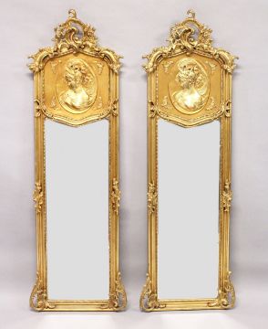 A LONG PAIR OF UPRIGHT GILT MIRRORS