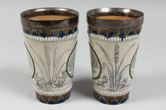A SUPERB PAIR OF HANNAH BARLOW DOULTON STONEWARE TAPERING BEAKERS with silver lips,