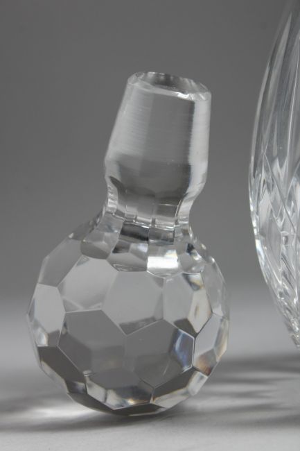 TWO CUT GLASS DECANTERS AND STOPPERS.