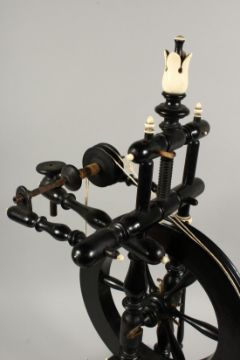 A VERY GOOD 19TH CENTURY SPINNING WHEEL with ivory buttons