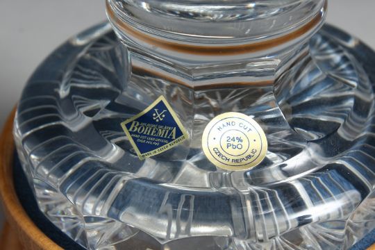 A SUPERB BOHEMIAN CUT CRYSTAL VASE on a wooden stand, in celebration of Her Majesty Queen Elizabeth, The Queen Mother's 100th year. 10.5ins high.