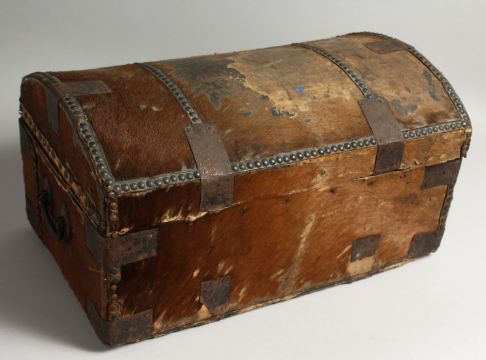 AN EARLY 19TH CENTURY MULE SKIN DOME TOP CHEST with carrying handles.