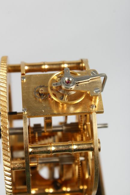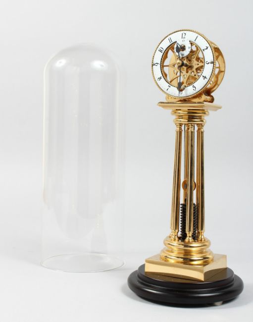 AN UNUSUAL BRASS COLUMN CLOCK with enamel dial, large spring driven movement, under a glass dome.