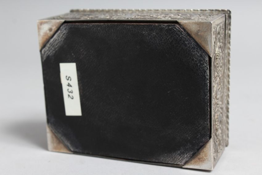 A VICTORIAN SILVER REPOUSSE DECORATED CIGARETTE BOX, 4.5ins, inscribed, presented to the Medical Staff Mess by Lt. Col. W. JOHNSTON, 1891