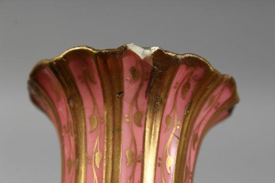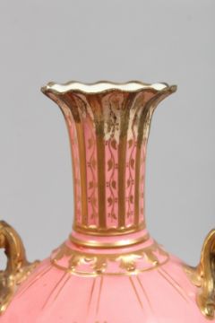 A PAIR OF ROYAL CROWN DERBY PINK GROUND TWO HANDLED VASES with gilt decoration