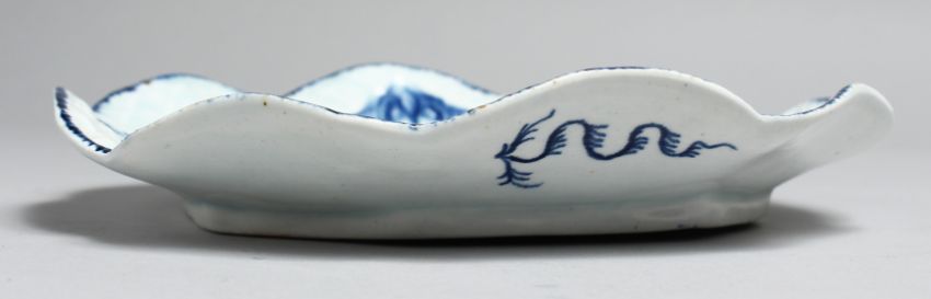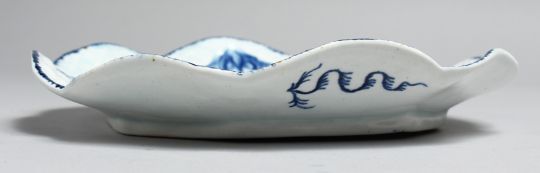 AN 18TH CENTRUY BOW BASKET WEAVE MOULDED DISH painted with flowers in underglaze blue.