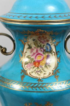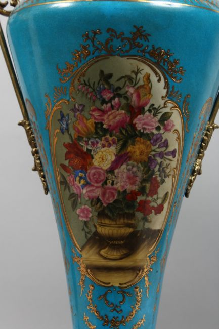 A PAIR OF SEVRES STYLE PORCELAIN AND ORMOLU TWIN HANDLED VASES AND COVERS decorated with flowers, 27ins high