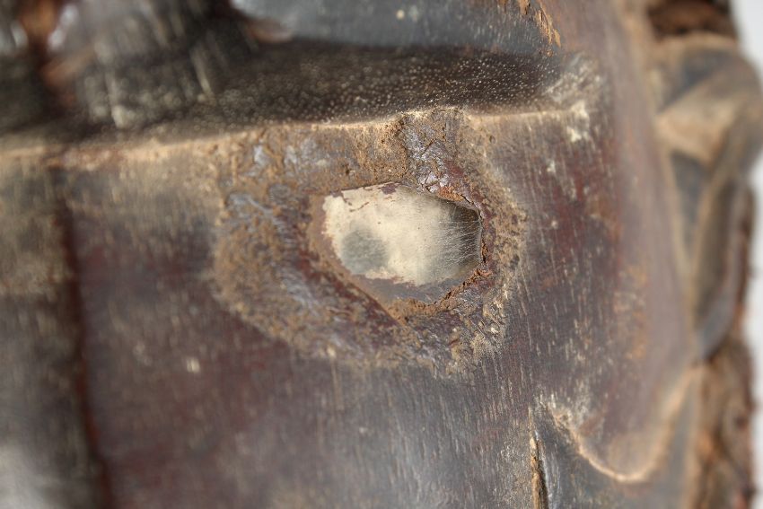 AN AFRICAN CARVED WOOD MASK the head with a scull and nails. 14ins long.