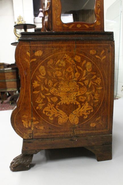 AN 18TH CENTURY DUTCH WALNUT AND MARQUETRY CABINET ON CHEST with a shaped cornice above a single glazed door with glazed sides enclosing two shelves, on a bombe chest with three graduated long drawers, with a shaped apron and carved paw feet.