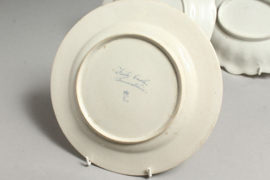AN 18TH CENTURY DERBY PLATE painted with a Fairy Castle, Somersetshire, under a lime green border, named scene and mark in blue. A CHELSEA DERBY PLATE with Smith's blue and gilt border painted with flowers in Sevres style, blue crown and D and AN OVAL DISH painted with green flowers outlined in black. (3)