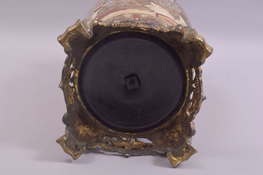 A JAPANESE SATSUMA PORCELAIN LAMP VASE with metal mounts, decorated with panels of figures, supported on a fitted metal base on four curving feet, 42.5cm high