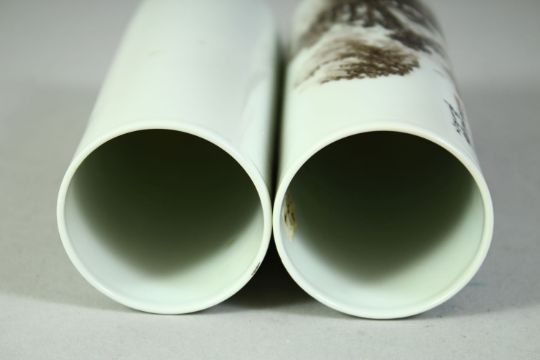 A PAIR OF CHINESE CYLINDRICAL PORCELAIN BRUSH POTS, on fitted hardwood stands, brush pot 13cm high.