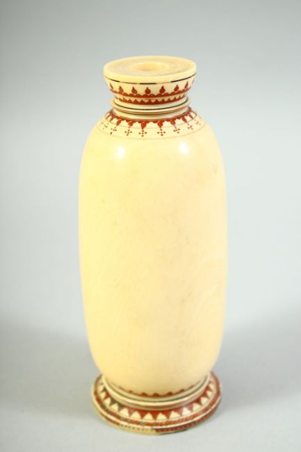 AN 18TH CENTURY CEYLONESE TURNED IVORY BOTTLE, the neck and foot rim with painted decoration, 16.5cm high.