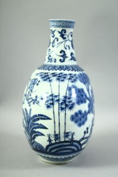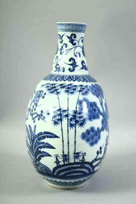 A CHINESE BLUE AND WHITE PORCELAIN MOONFLASK, decorated with bamboo, lotus and plum blossom, six character mark below neck, 31cm high.