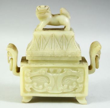 A CHINESE CARVED GREEN HARDSTONE TWIN HANDLE KORO AND COVER, the cover carved with foo dog, with ring handles and raised on four feet, 18cm wide.