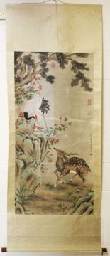 A GOOD LARGE CHINESE SCROLL PAINTING, depicting a crane on a mound with a deer surrounded with native flora, with five red seal stamps and inscription, image 130cm x 64cm.