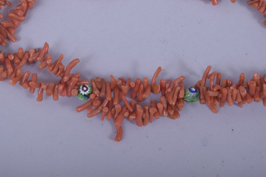 A NATURALISTIC CORAL NECKLACE, including seven small millefleur beads.