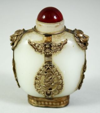 A CHINESE SILVER-METAL OVERLAID WHITE JADE-LIKE GLASS SNUFF BOTTLE & STOPPER, 3.5in high.
