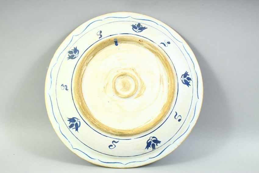 A TURKISH OTTOMAN IZNIK PLATE, decorated with a figure and flora, 31.5cm diameter.