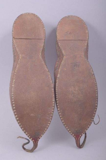A PAIR OF 19TH CENTURY OTTOMAN METAL THREAD LEATHER EMBROIDERED SHOES, 26cm long.