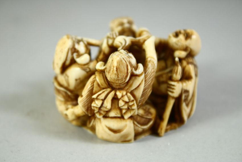 A JAPANESE CARVED IVORY NETSUKE, carved as four figures in a circle holding brushes, with red seal inset to base, 5cm wide.