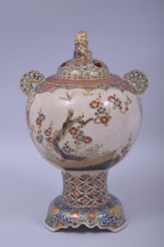 A JAPANESE MEIJI IMPERIAL SATSUMA KORO AND COVER, with two main panels of landscape scenes, with a stemmed foot, the cover with a shi shi dog, base with signature, 27.5cm high.