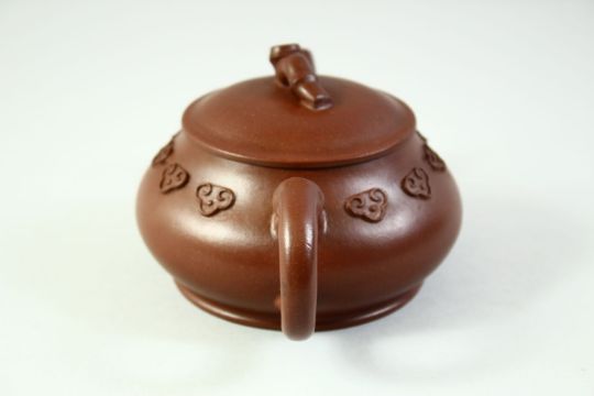 A CHINESE YIXING TEAPOT AND COVER, the inner lid and base with impressed marks, 16cm from handle to spout.