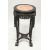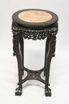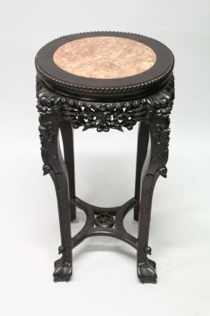 A CHINESE CARVED HARDWOOD AND MARBLE INSET VASE STAND, with pierced and carved frieze depicting cherry blossom, on four carved legs united by a stretcher, 41cm diameter, 80cm high.