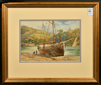 George Hodgson (1847-1921) British, 'At Ilfracombe', figures approaching a moored vessel, watercolour, 6.5" x 9.25".