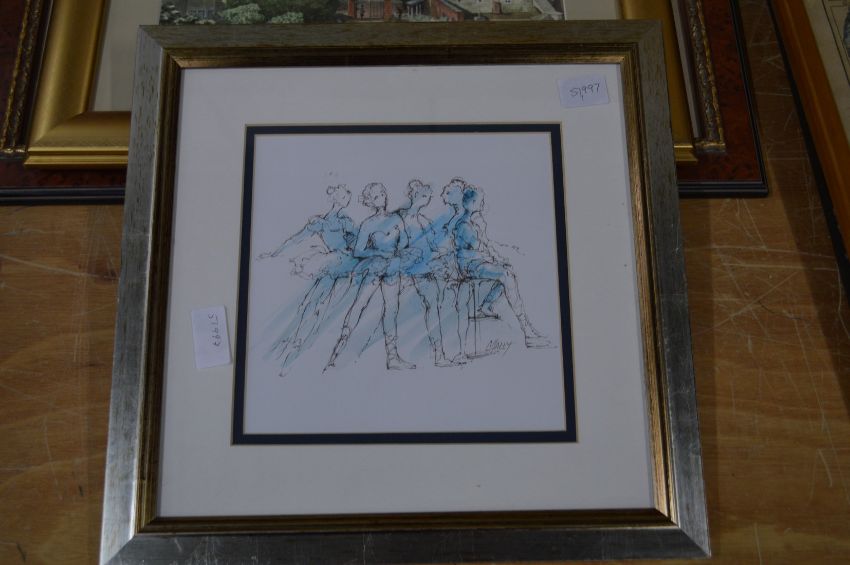 After Cecil Aldin "Figures Outside a Timber Framed Building" and three other paintings and prints.