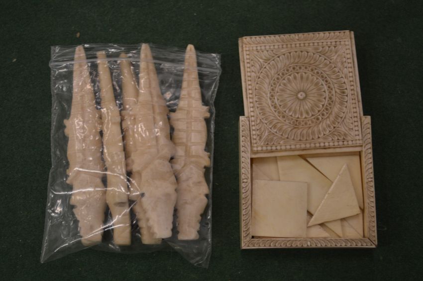 A Canton ivory small puzzle box and other items.