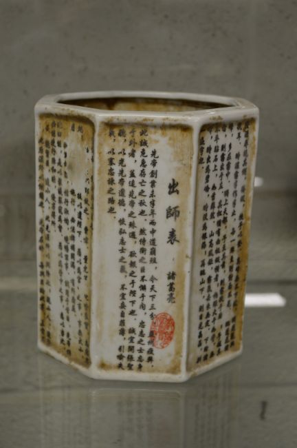 A Chinese octagonal shaped brush pot decorated with calligraphy.