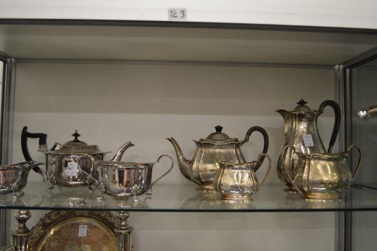 A silver plated three-piece tea service and a plated four-piece tea service with engraved decoration.