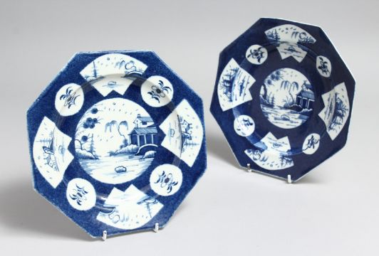 A PAIR OF WORCESTER POWDER BLUE OCTAGONAL PLATES with Chinese vignettes.