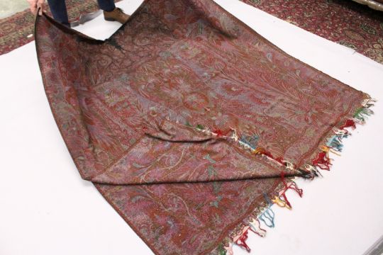 A GOOD LARGE KASHMIR TEXTILE, woven in reds and greens to a Paisley design.