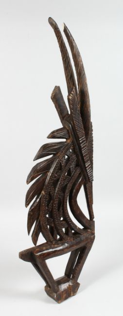 A BAMBARRA PIERCED AND CARVED WOODEN HEAD DRESS, 31ins long.