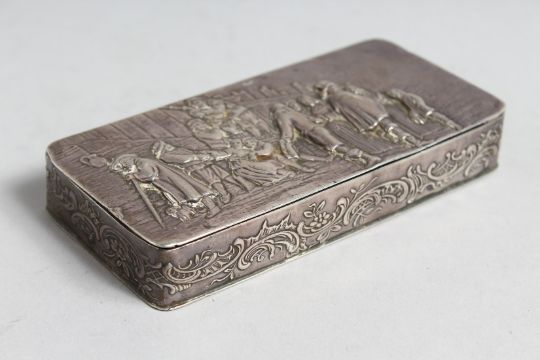 A 19TH CENTURY DUTCH OBLONG BOX, the lid repousse with figures. 4.75ins long.