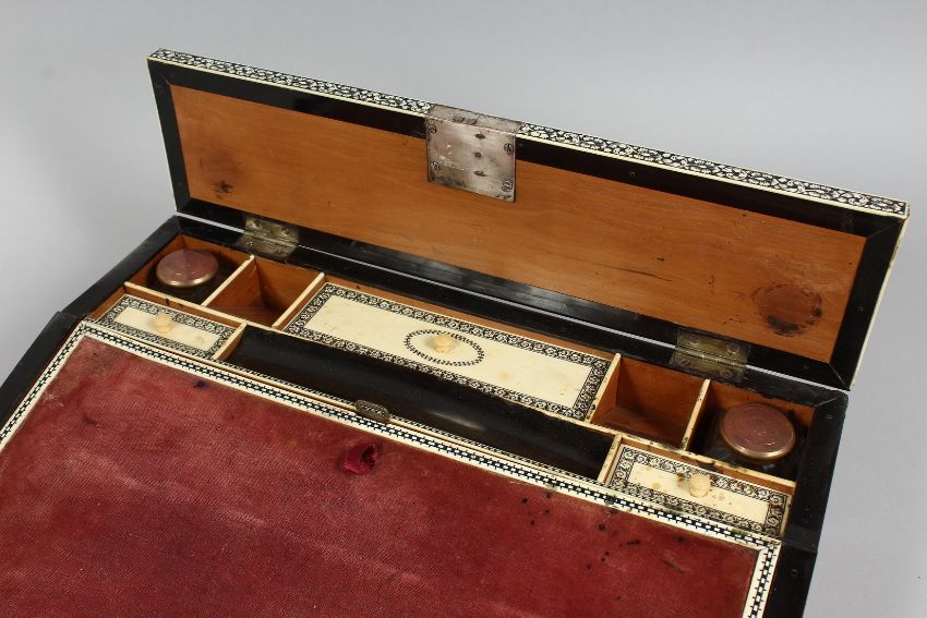 A SUPERB VIZAGAPATAM PORCUPINE QUILL FITTED WRITING SLOPE with ivory inlay and folding flap with ink wells and velvet writing slope.