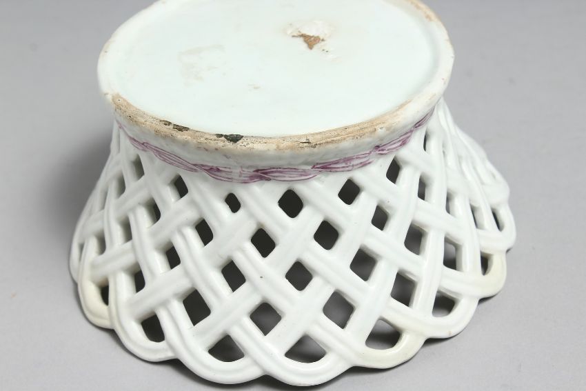A MID 18TH CENTURY BOW SMALL BASKET with pierced sides painted with flower sprigs and sprays, in famille rose palette.