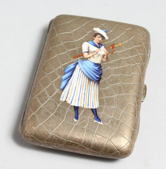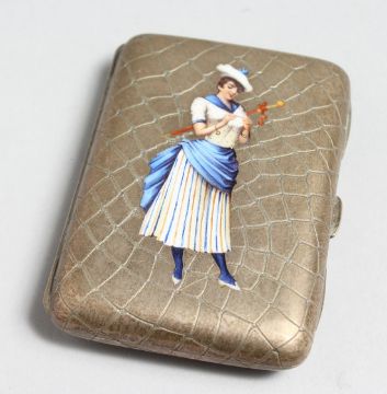 A FRENCH .800 SILVER AND ENAMEL CIGARETTE BOX the lid with a girl. Maker C. A. S. 3.5ins long.