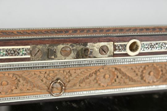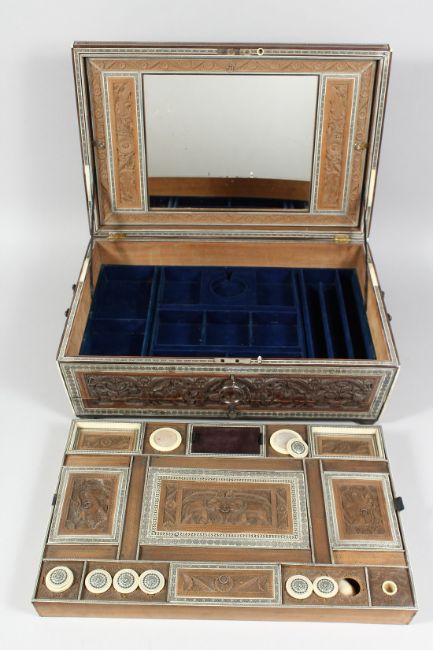 A GOOD SANDALWOOD AND CARVED CEDAR WOOD WORK BOX with carved panels and fitted interior with mirror.