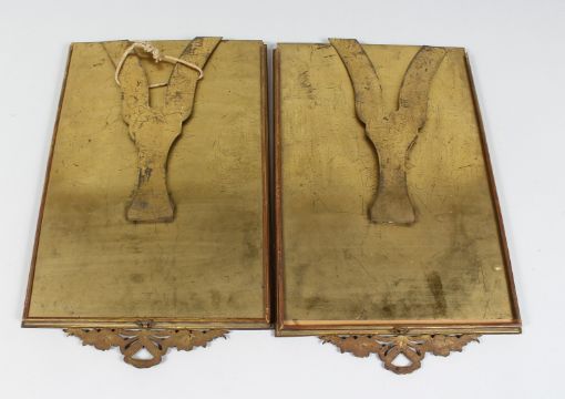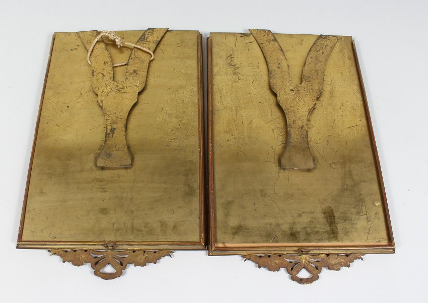 A PAIR OF ORMOLU RECTANGULAR UPRIGHT PHOTOGRAPH FRAMES with ribbon and bow cresting.